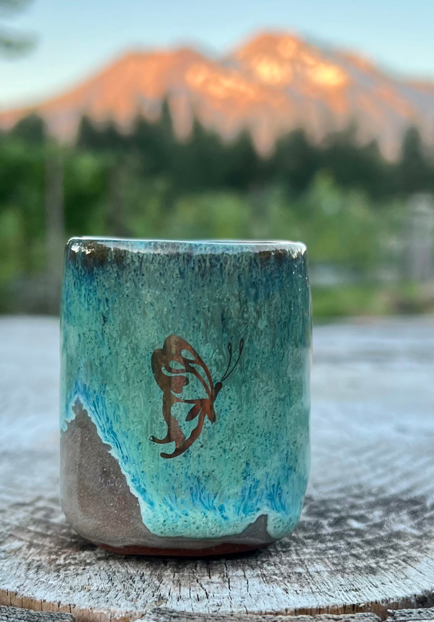 Gilded cordial cup with Seafoam/ Fawn glaze and 3 Gold butterflies 2oz